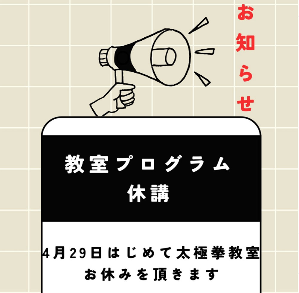 お知らせです。4月29日(水)のはじめて太極拳教室はお休みとなります。